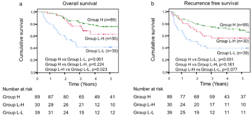 術前Prognostic nutritional index (PNI)高値(Group H)、術前PNI低値かつ術後PNI高値(Group L-H)、術前術後PNI低値(Group L-L)の生存曲線の比較