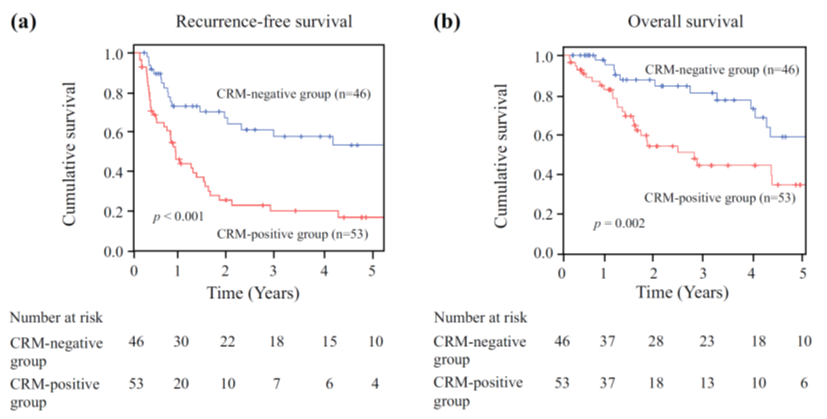 浜松医科大学および静岡県立静岡がんセンターで切除されたpT3食道扁平上皮癌の病理組織検体を用いて至適周囲切除断端(CRM)の検討を行い、従来のThe Royal College of Pathologists (RCP) criteriaおよびThe College of American Pathologists (CAP) criteriaと比較し、術後の局所領域再発を予期し得る優れた指標として、CRM 600 µmの有用性を報告いたしました。