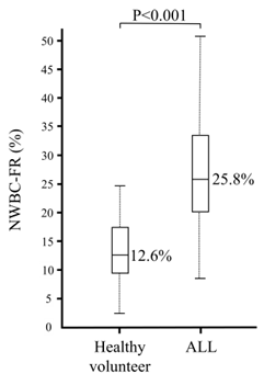 2D位相イメージングフローサイトメーターの概略、および健常人と癌患者における末梢血有核細胞中の非白血球分画比率(NWBC-FR)の比較