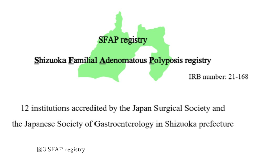 大腸全摘除後の長期成績が術式により異なることを報告しました。最近では、静岡県内遺伝性大腸癌診療のネットワーク形成に向けて、多施設共同研究を行っております。家族性大腸腺腫症に関する本邦のevidenceは非常に少ないため、更なる知見を得るため、静岡県内の日本外科学会指定・関連施設及び、日本消化器病学会認定施設である12施設からなる“SFAP Registry”を立案しました。今後、このレジストリを活用した研究や臨床応用を目指していきます。