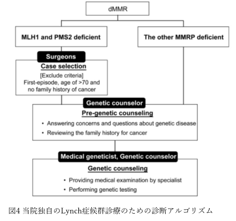当院では2016年9月より全大腸癌切除症例に対して免疫染色法によるユニバーサルスクリーニングを開始し、2020年1月から、消化器外科医、消化器内科医、臨床遺伝専門医、遺伝カウンセラー、病理医による多職種チームを発足し、診療体制の整備を行いました。更に、BRAF V600EやMLH1メチレーション検査の代わりに、遺伝カウンセラーによるプレ遺伝カウンセリングとアムステルダム基準Ⅱまたは改訂ベセスダガイドラインから構成された除外基準を設けた当院独自のLynch症候群診断アルゴリズムを開発しました。現在、我々が独自に構築したLynch症候群診療のための診断アルゴリズムを多施設に導入し、情報共有することで、遺伝性消化器疾患に対する充実した診療体制の構築が可能になると考え、現在臨床研究を継続しております。