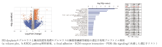 CACは炎症性腸疾患患者において重要な予後規定因子の一つとして知られておりますが、その発癌メカニズムはまだ不明な点が多く、予防法の確立は重要な課題と考えられます。当科では、腫瘍微小環境を構成する腸管筋繊維芽細胞(IMF)の遺伝子発現プロファイルを解析することにより、IMFが産生するtenascin-CがCACの前癌病変であるdysplasiaの段階より、腫瘍進展に強く関連する事を報告しました。