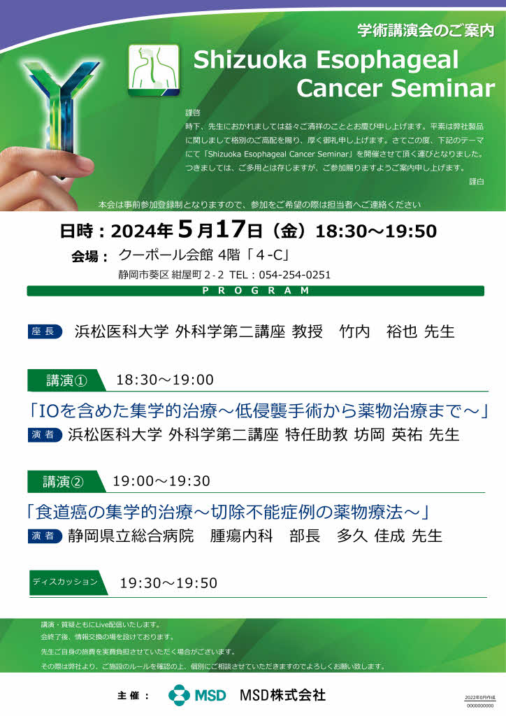 TOP >  セミナー・研修会情報 >  2024年5月17日18:30よりShizuoka Esophageal Cancer Seminarが開催されます。