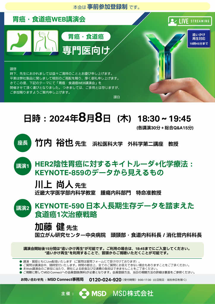 2024年8月8日(木)18:30より「胃癌・食道癌WEB 講演会」が開催されます。