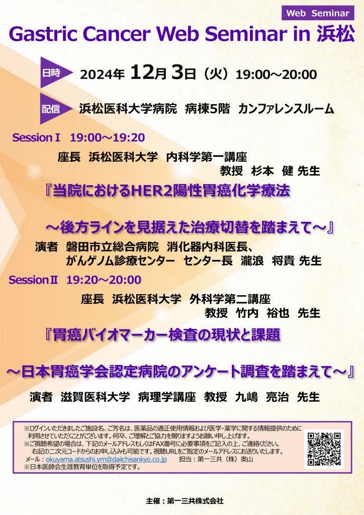 TOP >  セミナー・研修会情報 >  2024年12月3日(火)19:00より「Gastric Cancer Web Seminar in 浜松」が開催されます。