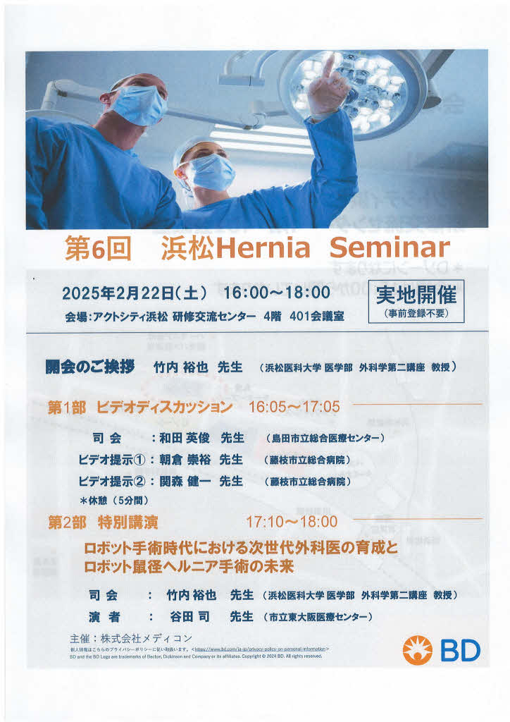 2025年2月22日(土)16:00より「第6回 浜松Hernia Seminar」が開催されます。