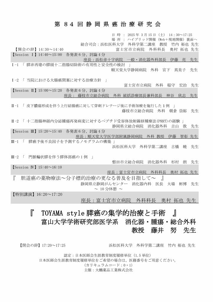 2025年3月15日(土)14:30より「第84回静岡県癌治療研究会」が開催されます。
