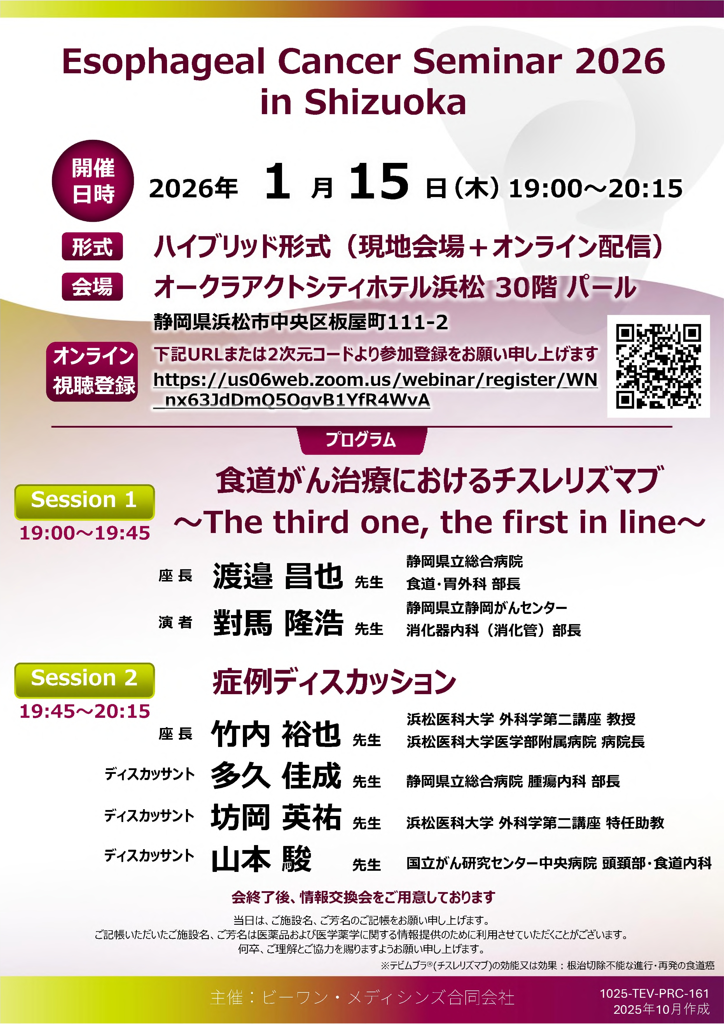 TOP >  セミナー・研修会情報 >  2026年1月15日(木)19:00より「Esophageal Cancer Seminar 2026 in Shizuoka」が開催されます。