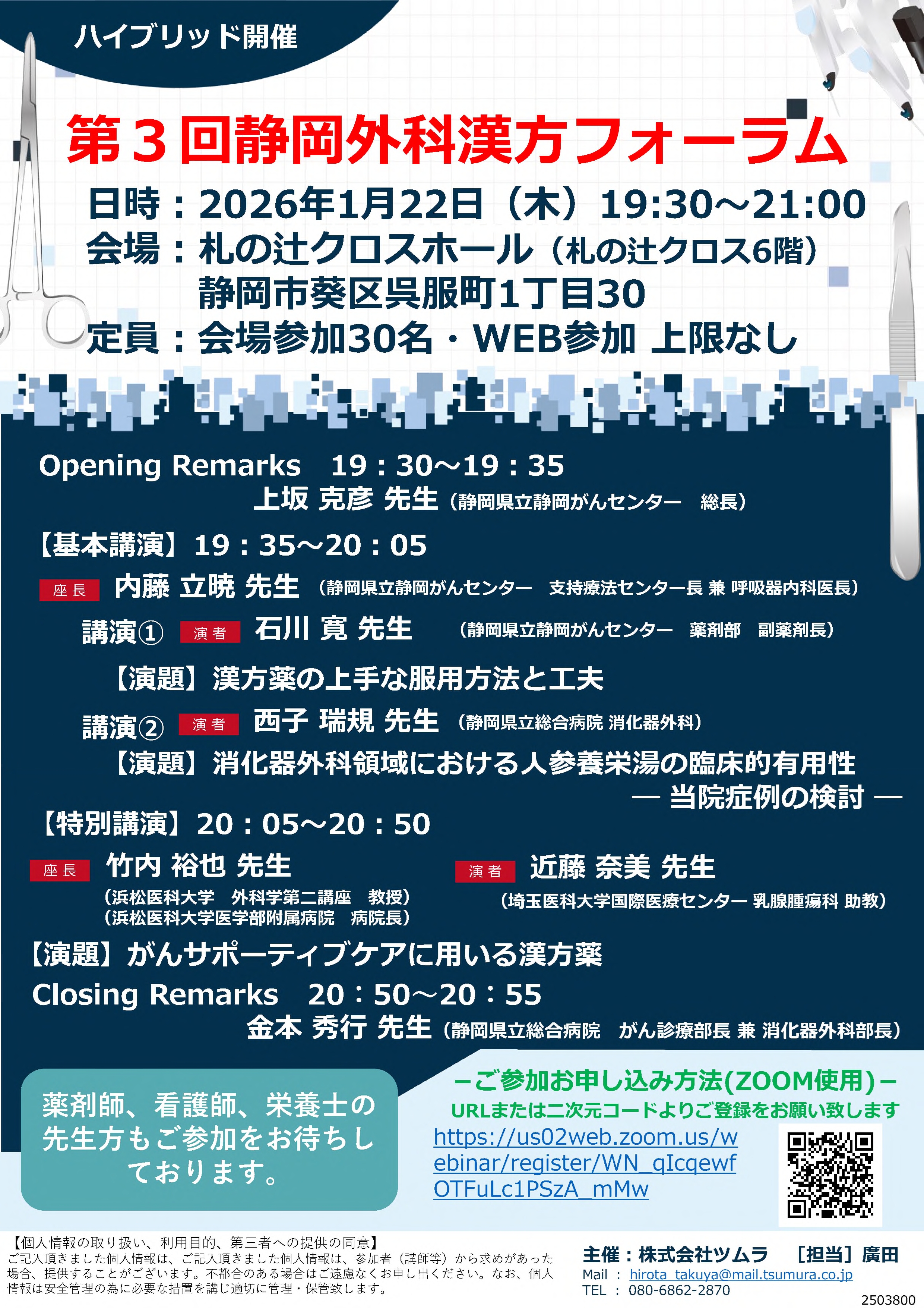 2026年1月22日(木)19:30より「第3回静岡外科漢方フォーラム」が開催されます。
