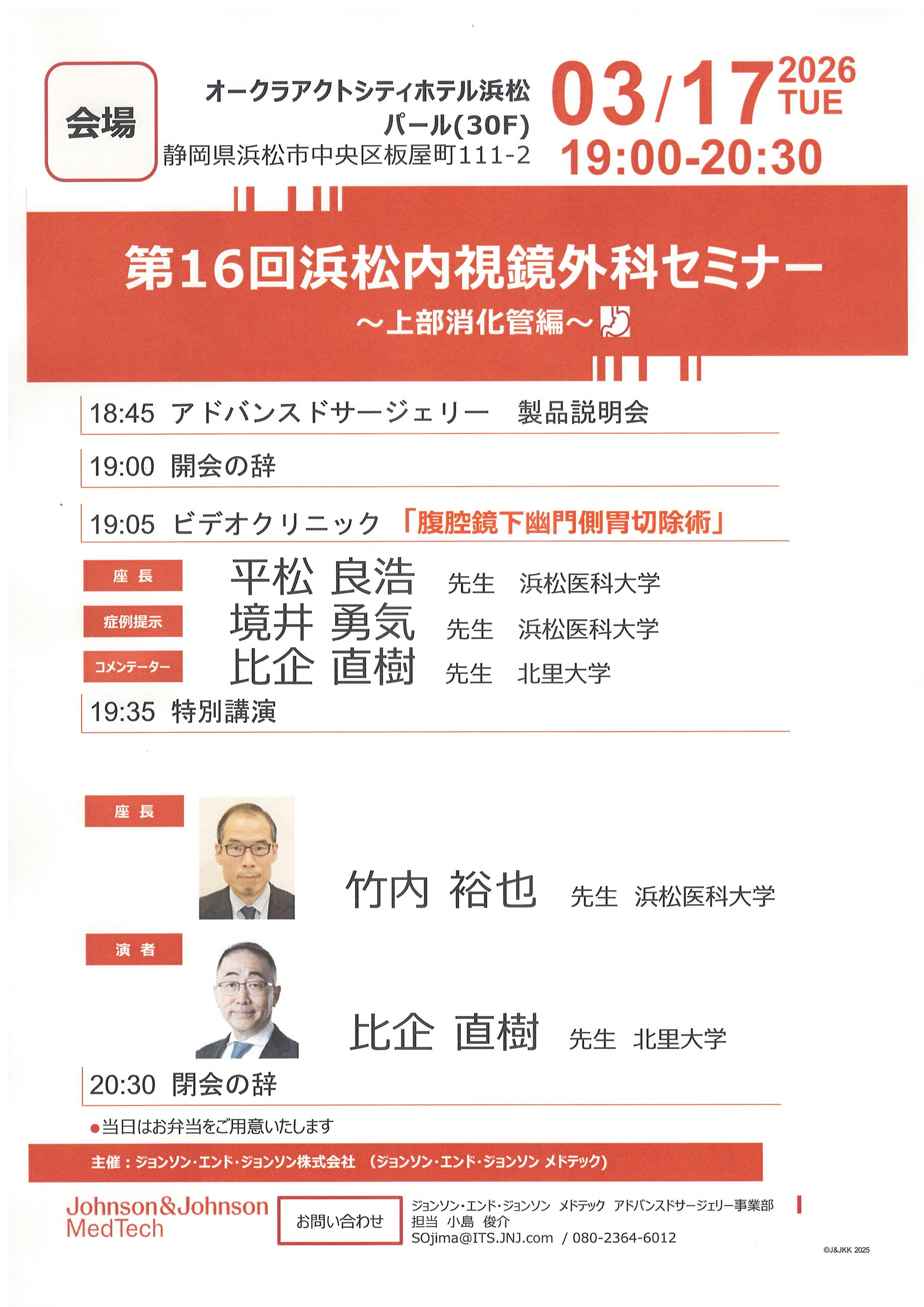 2026年3月17日(木)19:00より「第16回浜松内視鏡外科セミナー ~上部消化管編~」が開催されます。