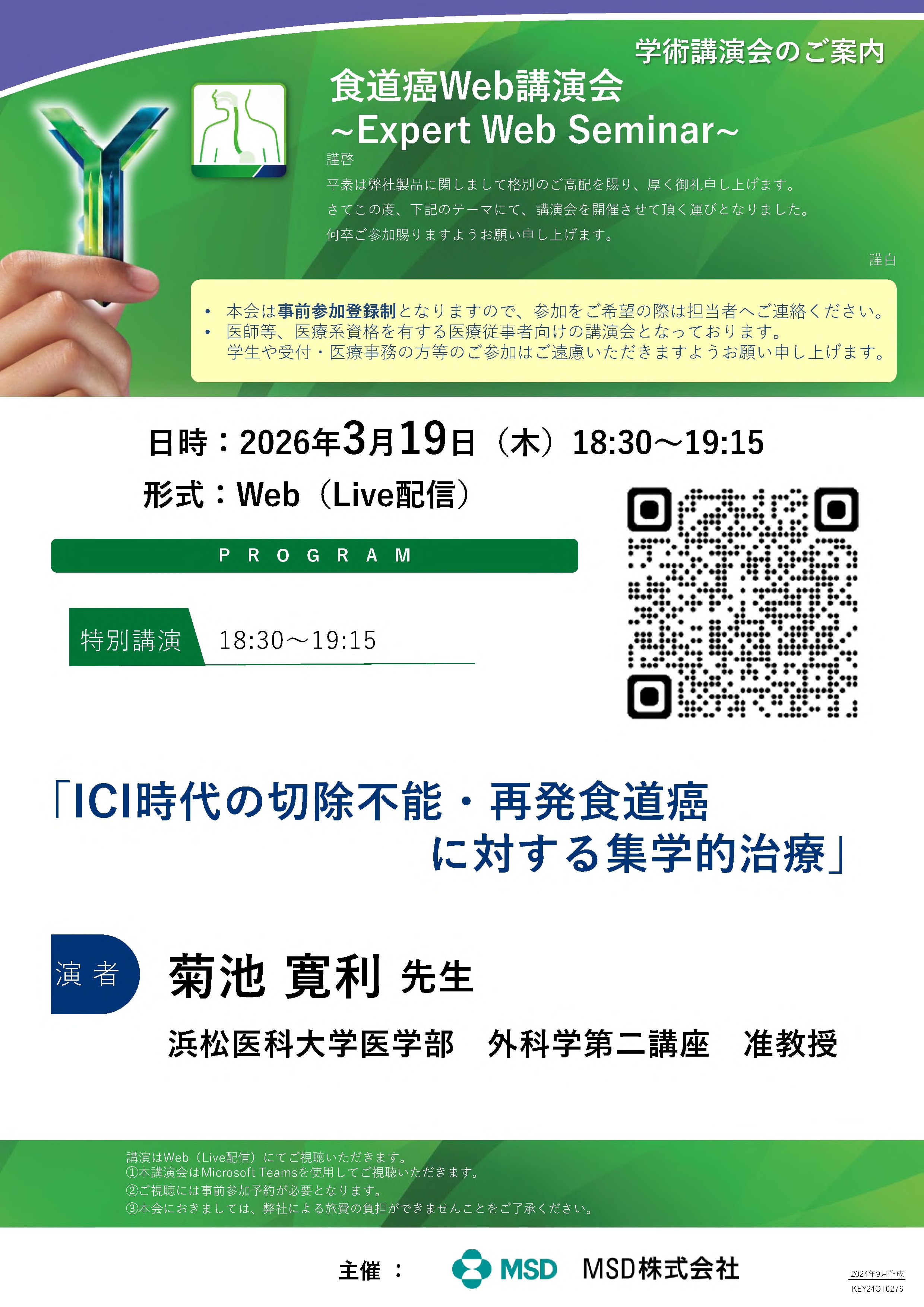 2026年3月19日(木)18:30より「ICI時代の切除不能・再発食道癌 に対する集学的治療」が開催されます。