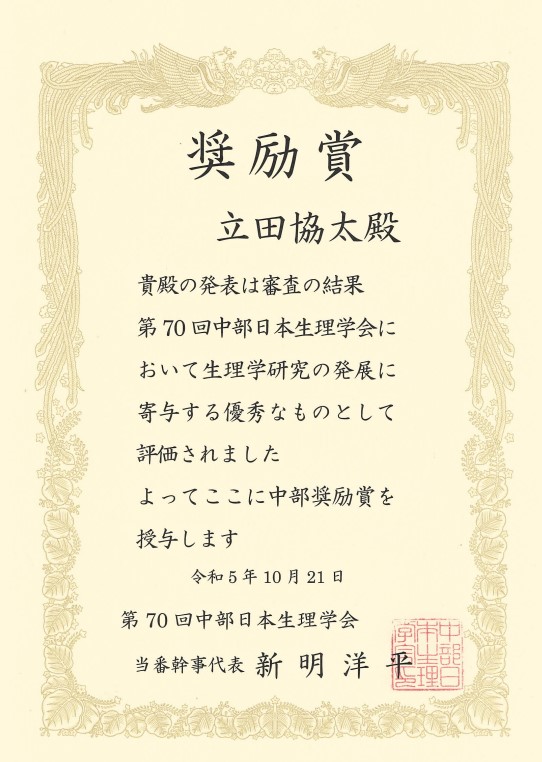 立田協太先生が第70回中部日本生理学会で奨励賞を受賞しました。