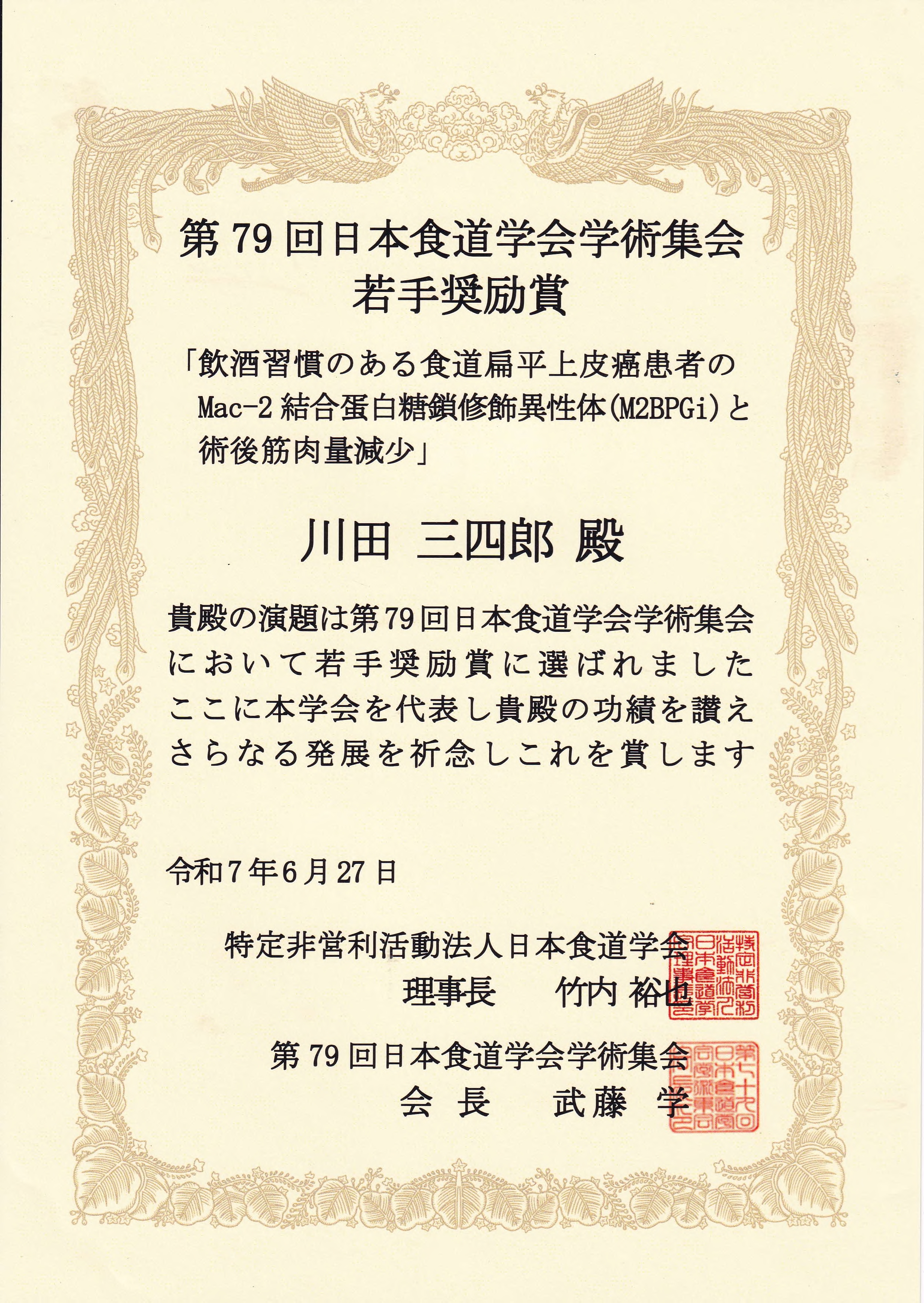 川田三四郎先生が第79回日本食道学会学術集会で若手奨励賞を受賞しました。 本研究は食道扁平上皮癌患者における、術前のMac-2結合蛋白糖鎖修飾異性体(M2BPGi)と術後の筋肉量変化の関連を検討したものです。 坊岡先生、竹内教授をはじめ、ご指導いただいた諸先生方に心から御礼申し上げます。 川田三四郎