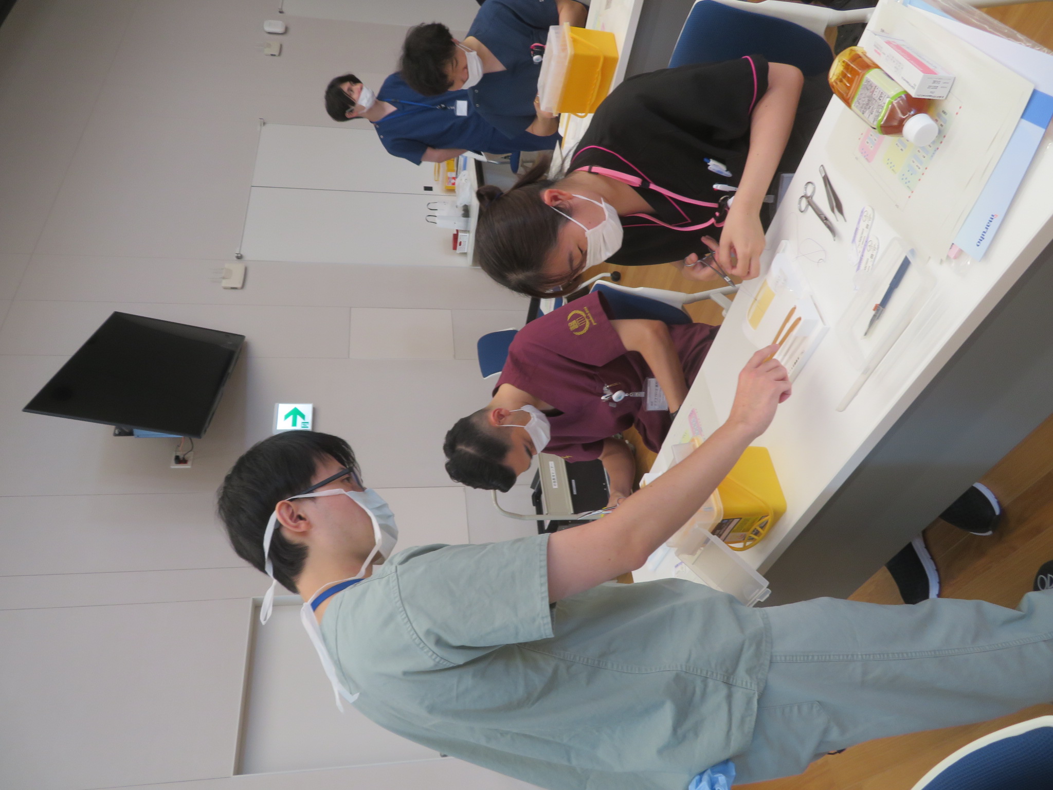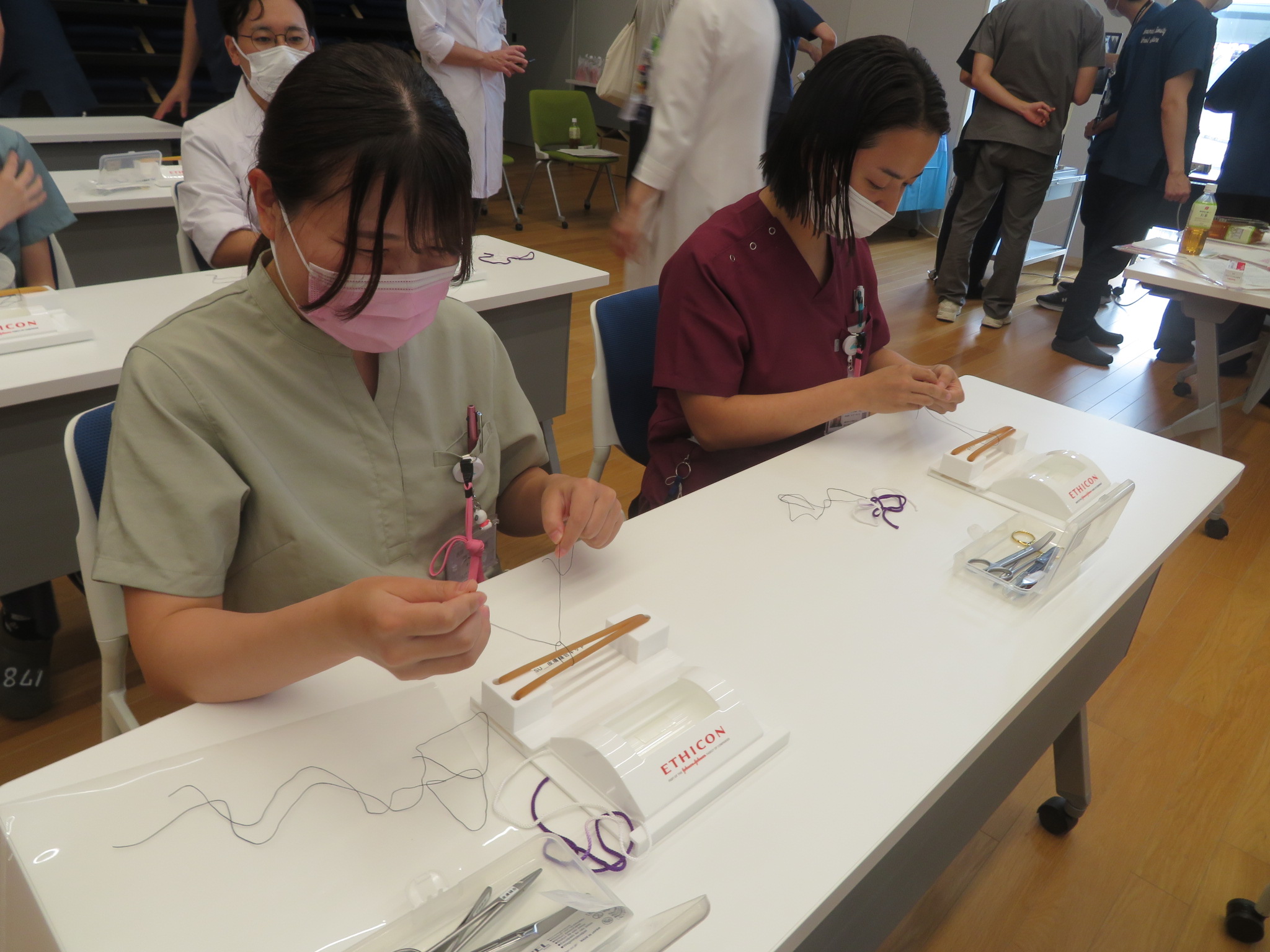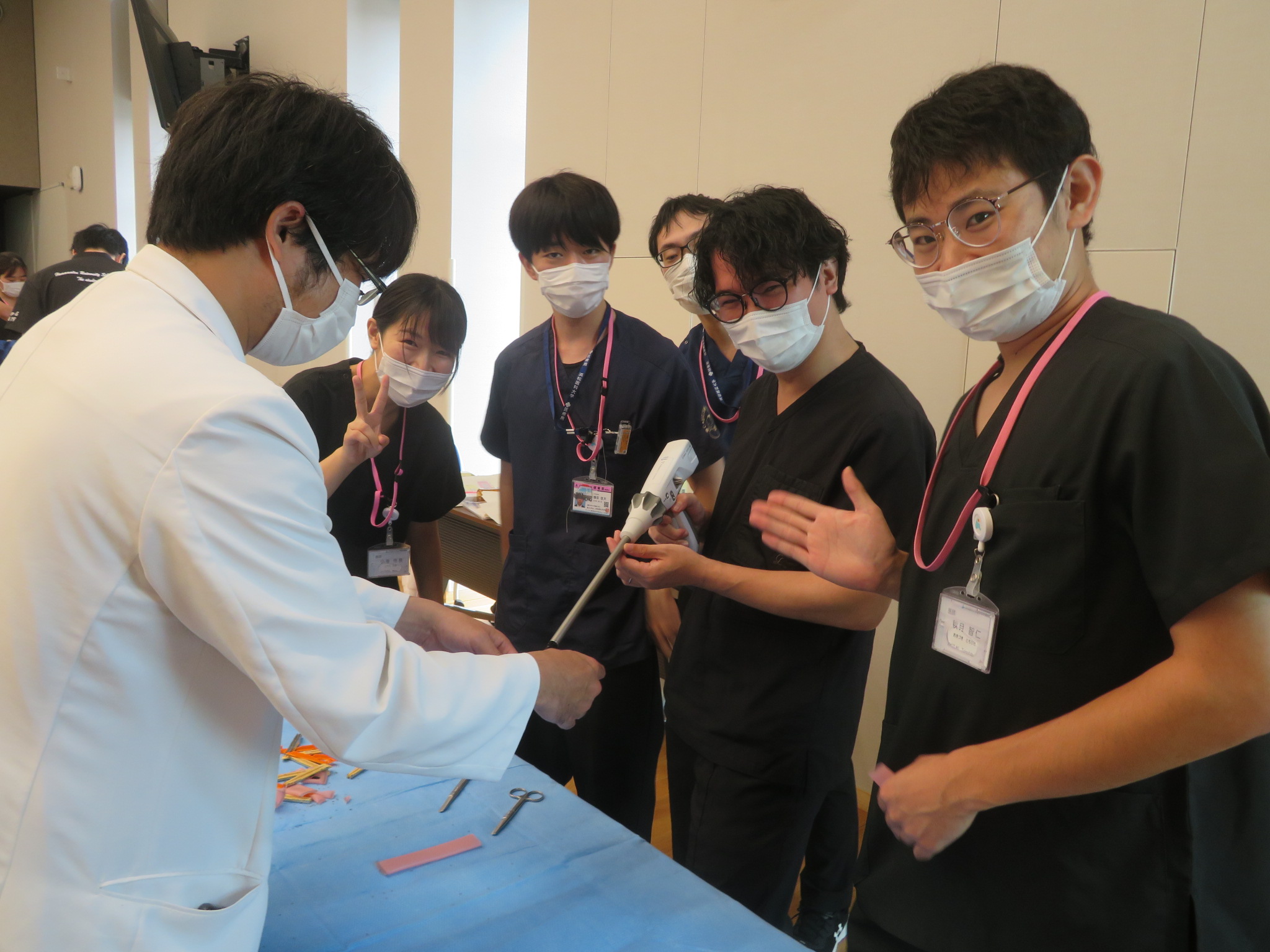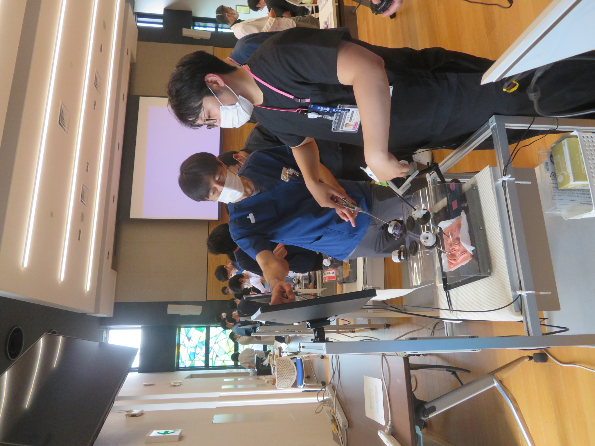 今回は、The 1st Hamamatsu Surgical Skills Challengeと称し、糸結び、器械結びなどの外科基本手技やラパロボックスでの縫合、実際に手術で使用される医療機器を用いた腸管吻合を実践していただきました。タイムトライアルで事前学習による練習の成果を発揮し、糸結びは3分間で100回近く結べた先生もいて、みなさん一生懸命に取り組まれていました。