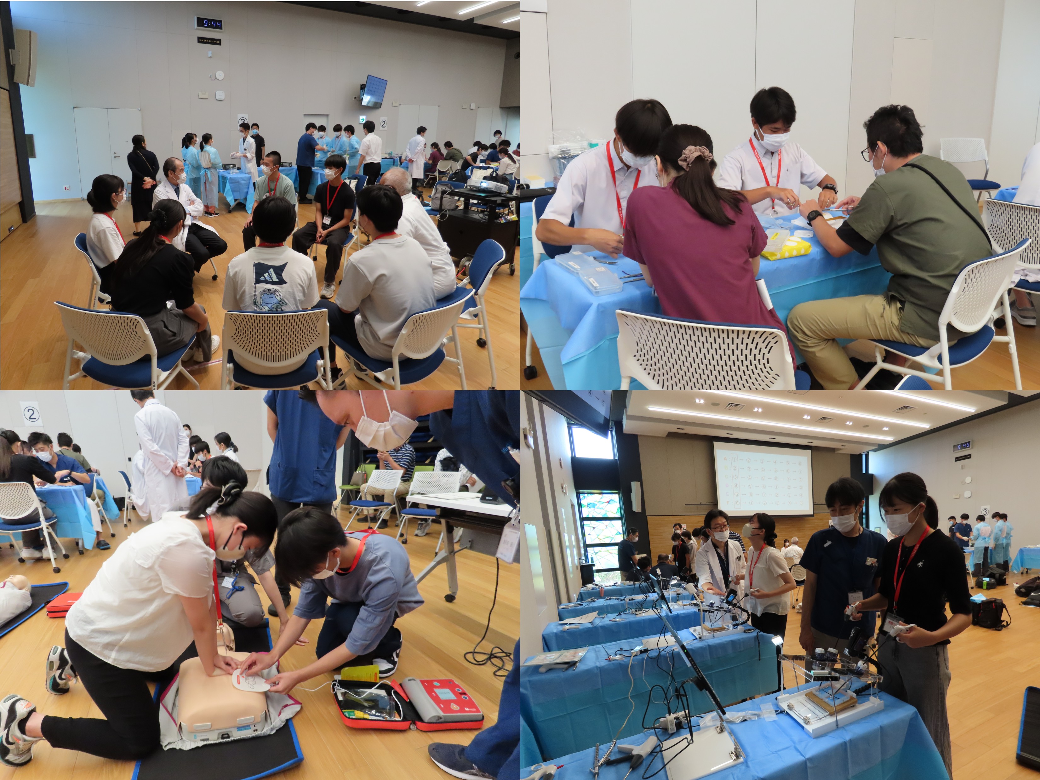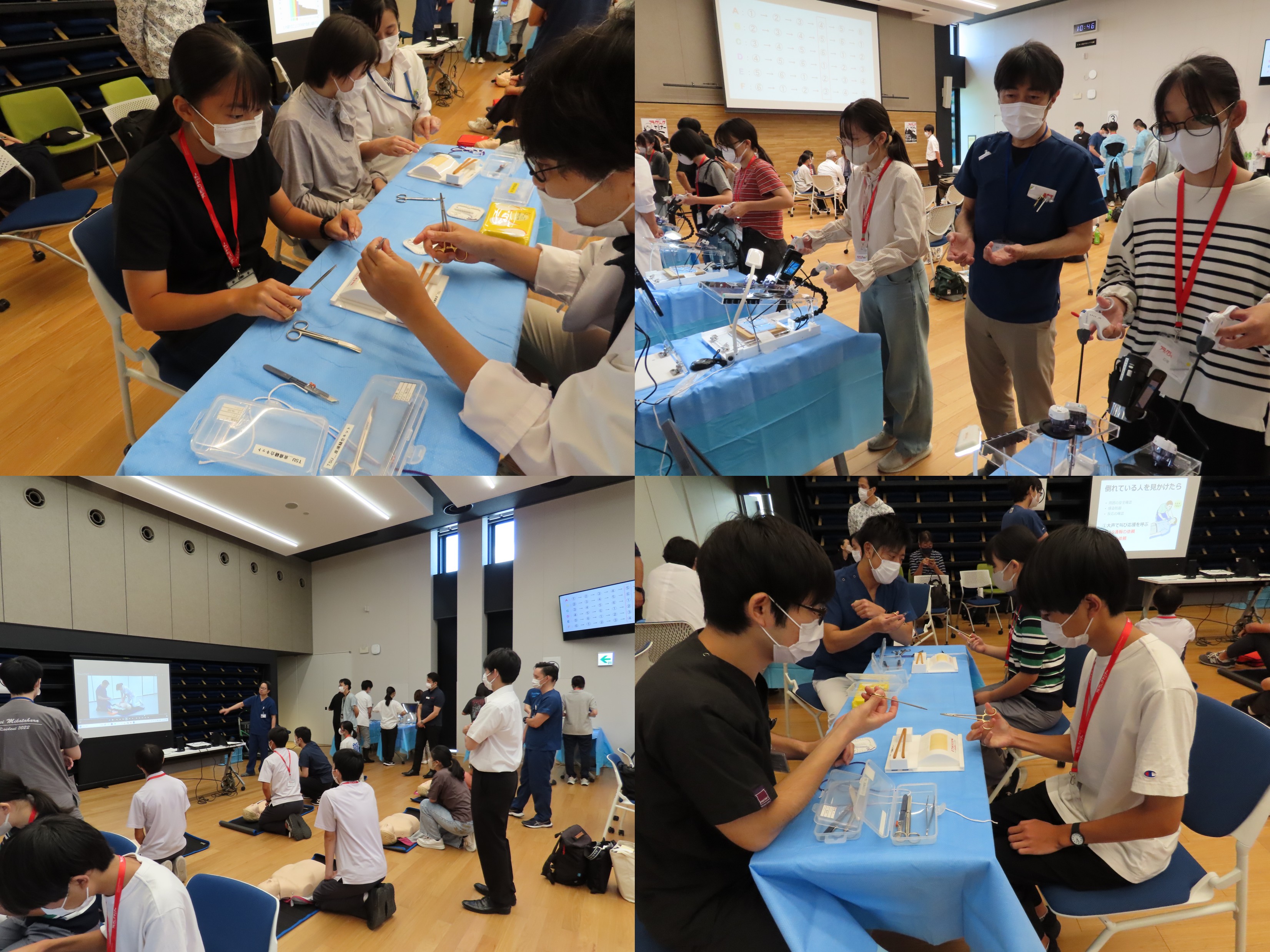 当日は開会挨拶、セミナー受講注意事項の説明、スタッフ紹介、集合写真撮影の後、6グループに分かれ、①救命救急・AED体験、②手術縫合体験、③最新医療機器体験(超音波メス)、④自動縫合器・吻合器体験、⑤内視鏡手術トレーニング体験、⑥竹内裕也教授・岡本一真教授との面談のブースを順番に回っていただきました。セミナー終了時には、参加者全員へ終了証書を授与いたしました。