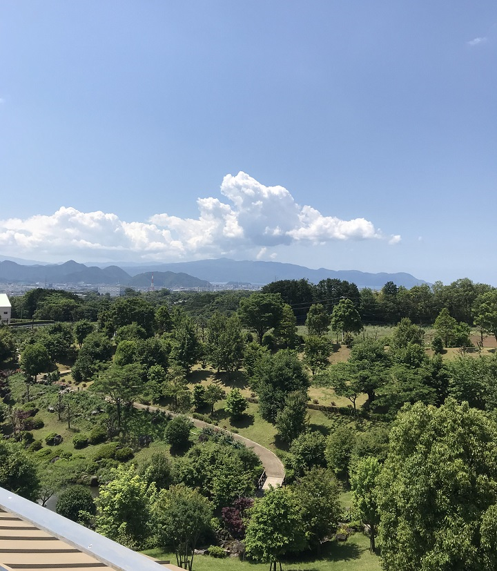 病院リハビリ室テラスから望む院内バラ園と駿河湾