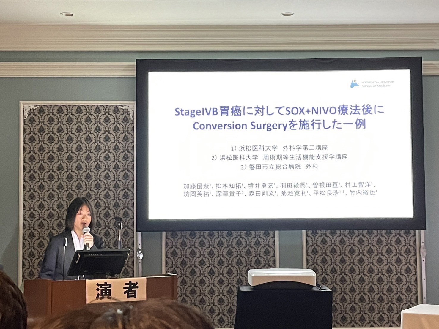 私の発表テーマは『Stage IVB胃癌に対するSOX+NIVO療法後のConversion Surgery』でした。進行胃癌の新しい治療戦略に関する症例報告で、最新のガイドラインや関連文献を詳細に調査しました。スライド作成の過程では、先生と繰り返しディスカッションを重ね、症例への理解を深めることができました。