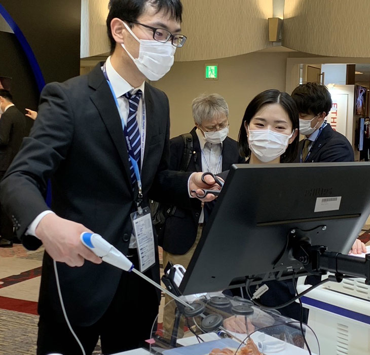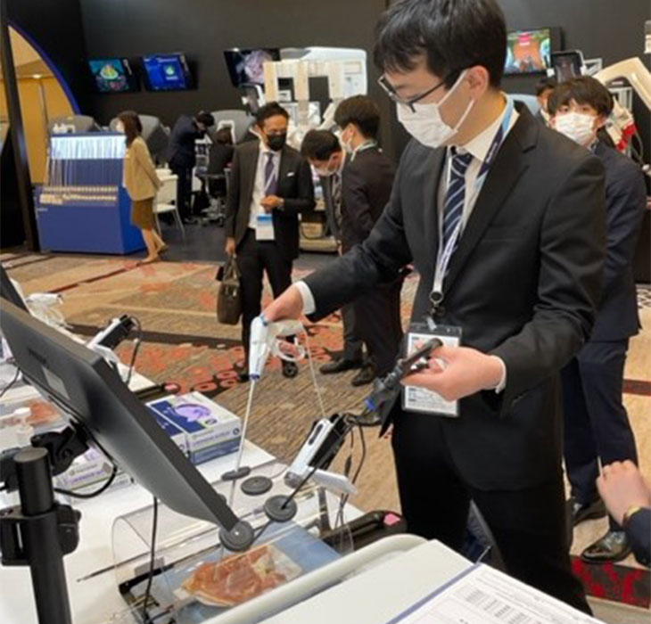 学会には医療機器メーカーの出展もあり、実習では触れることのできなかった医療機器にもたくさん触らせていただきました。そこではバイポーラを使って鶏肉を切る体験をさせていただき、楽しかったです。手の小さい女性でも扱いやすいようにハンドルの大きさが工夫されていました。やはり、女性外科医の数が増えていて、そういう工夫が求められているのだと思いました。手術支援ロボットも大学にあるようなオーソドックスな形だけでなく、コンソールが開放されているものやシングルポートのものもあり、色々需要があるのだと見ていて興味深かったです。