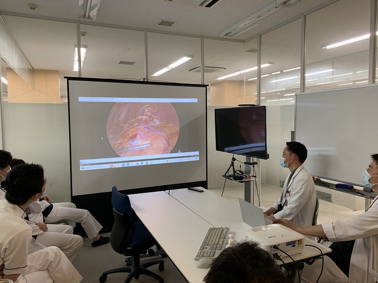 手術に関しては開腹手術の助手から始まり、徐々に術者の担当が増えてきました。開腹症例は進行癌や化学療法後、他臓器合併切除の割合が高く、特に肝十二指腸間膜郭清や膵体尾部合併切除のようなこれまであまり経験のなかった症例もスタッフの指導のもとで執刀の機会をいただきました。定型手術のみならずこのような拡大手術も経験することができるのはがんセンターの特徴だと感じております。腹腔鏡手術の執刀は基本的にはレジデントに限定されており、スタッフの指導のもと定型化された静がん式メソッドを徹底的に勉強します。その豊富な症例数を活かし、内視鏡技術認定の取得のために短期間で多くの症例が集中して割り当てられます。1例ごとに綿密な振り返りを行い、課題や改善点をはっきりさせていくことで短期間での技術向上が実感できました。執刀以外のレジデントも手術中は術野外で積極的に議論を交わしており、適切な剥離層の維持や手順の確認、効率的な術野展開の方法について統一された認識の形成に余念がありません。チーフレジデントとしてもこのような場面でレジデントに対して積極的に指導をしていく必要があり、もともと大学病院で多くの執刀をさせていただいていた経験をがんセンターでさらに深めることにより、より一層の研鑽になったと感じています。現在では当科における進行癌に対する標準術式はロボット支援下手術となっております。今後ロボット症例はさらに増加していくことが予想されますが、レジデントへのロボット手術の修練も並行して開始され、私もロボット支援下胃切除術の初症例を執刀することができました。ロボット手術の台頭により若手外科医の症例経験が減少していくことが一般的に危惧される中、開腹、腹腔鏡、ロボットと多様な術式が経験できるがんセンターの利点は、今後の若手外科医の技術習得において大いに強みとなってくると感じました。