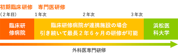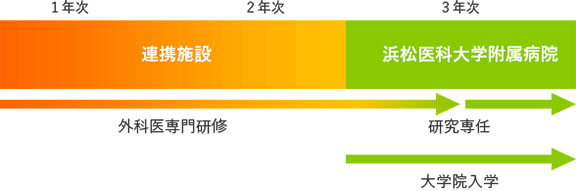 2年次まで連携施設で外科専門医研修を行い、3年次から浜松医科大学大学院に入学します。大学院で研究専任となる期間は基本的に後半の6か月以内です。