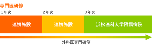 専門研修1・2年目は連携施設、専門研修3年目は基幹施設での研修です。連携施設、基幹施設のローテイションの順番を入れ替えることも可能です。 単施設のみの手技でなく、多施設の手技を学ぶことができ、外科医として幅広い手術手技を短期間で身に付けるメリットがあります。