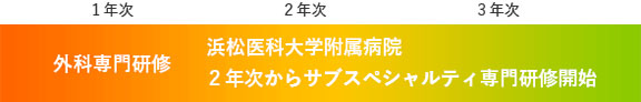 連携施設群(サブスペシャルティ専門研修施設)のうちいずれか、または浜松医科大学附属病院に所属し研修を行います。外科専門習得に必要な症例数ならびに基本領域の研修が充足した場合、志望するサブスペシャリティ領域の症例を中心に研修を行うことができます。 一般外科/麻酔/救急/病理/消化器/心・血管/呼吸器/小児/乳腺・内分泌 経験症例350例以上/2年 (術者120例以上/2年)