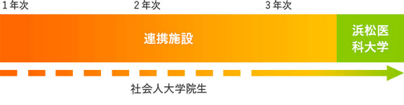 社会人大学院生の制度を利用して1年次、2年次から連携施設で研修しながら大学院の講義を受講することができます。3年間のうち6か月以上は基幹施設である浜松医科大学で研修を行います。