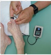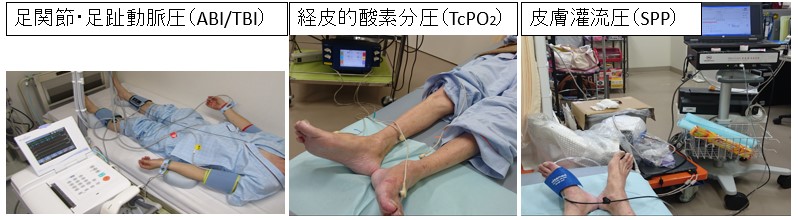 両手両足に血圧計のようなもの(マンシェット)を巻いて手足の血圧の比率を測るABI、センサーを特定の場所につけて熱を加えて皮膚から放散される酸素を測定する経皮的酸素分圧:TcPO2、センサーを特定の場所につけてマンシェットを巻いて皮膚の微細な血圧変化を測る皮膚灌流圧(SPP)があります。ただマンシェットの締め付けであったり測定場所が限定されてしまったり、測定に長時間の安静が必要であったりと測定に制限があったりします。