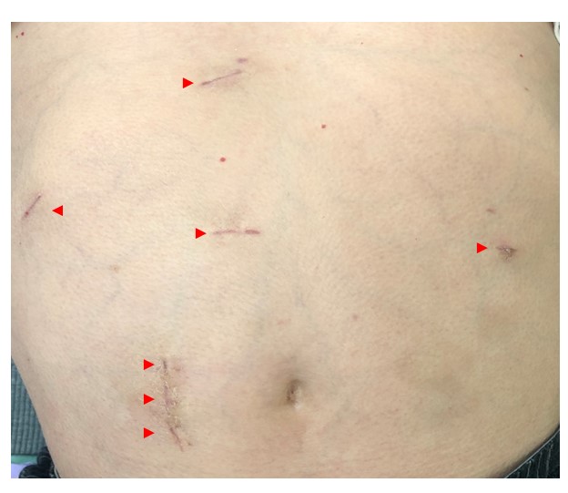 肝臓の手術には開腹肝切除といって大きくお腹を切る手術と、腹腔鏡肝切除といって傷の小さな手術があります。開腹手術では、お腹の真ん中を切る正中切開に加えて、横にも切開を加えて手術をすることもあります。傷の長さが合計で40~50cmになることもあります。開腹手術のメリットとしては、大きな視野の中で手術ができるので、安全性が高いとされています。また、肝臓や腫瘍を直接触って診察できるので、腫瘍との距離をリアルタイムに確認しながら手術を行うことができます。開腹手術のデメリットとしては、やはり手術後の痛みが強いことが挙げられます。高齢の患者さんでは、痛みによって痰がうまく出せなくなり、手術後の肺炎などを起こしやすくなってしまうこともあります。