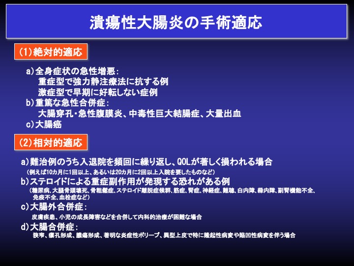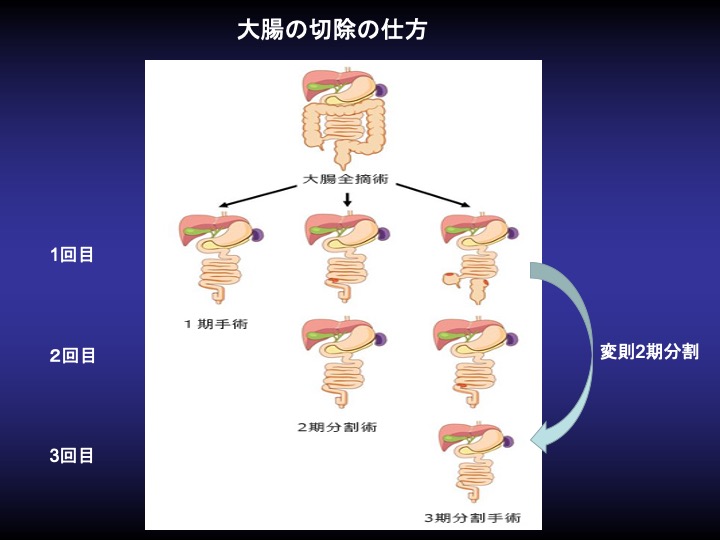 1)結腸全摘+回腸ストーマ 、直腸粘液瘻(直腸はとらない)