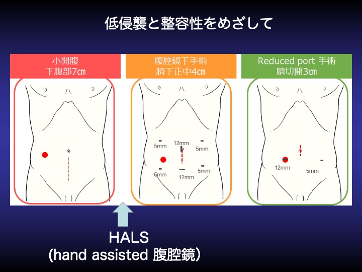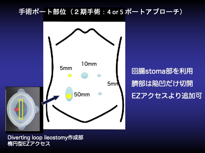 時代の変遷とともにより低侵襲で整容性に優れた腹腔鏡大腸全摘J型回腸嚢肛門(肛門管)吻合+回腸一時的人工肛門造設術を標準手術としています。